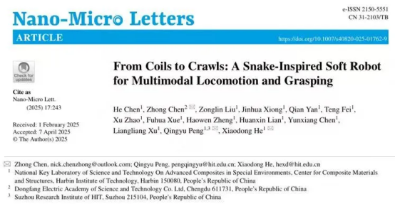 Ïà¹ØÐ§¹ûÒÔ¡¶From Coils to Crawls: A Snake-Inspired Soft Robot for Multimodal Locomotion and Grasping¡·ÎªÌ⣬£¬£¬£¬£¬£¬¶«·½Ñо¿Ôº³ÂÖÙ²©Ê¿Óë¹þ¶û±õ¹¤Òµ´óѧºÕÏþ¶«ÔºÊ¿¡¢ÅíÇìÓî½ÌÊÚΪÅäºÏͨѶ×÷Õß¡£¡£¡£¡£¡£¡£¡£